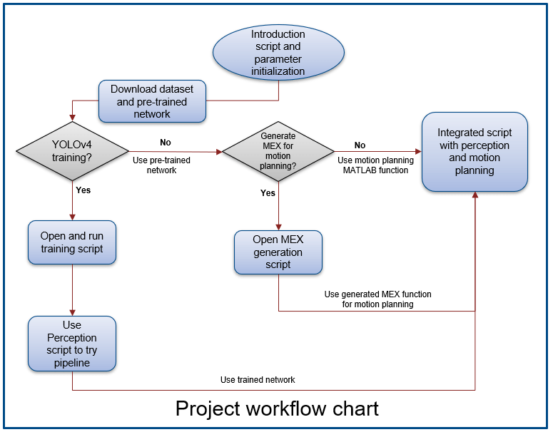 This flow chart shows the complete workflow that uses the Live Scripts available in Perception, Motion Planning, and Integration folders of the MATLAB project.
