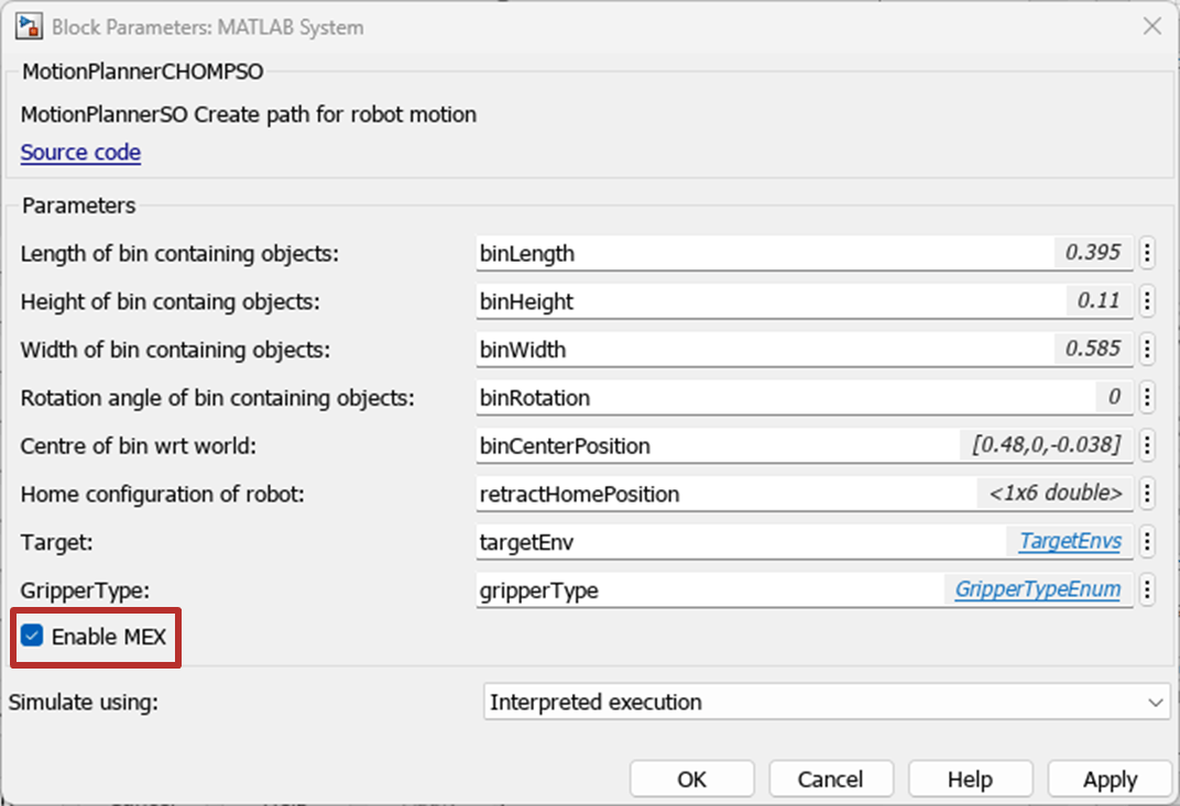 Step 2: Select the Enable MEX option in MotionPlannerCHOMPSO block in the Motion Planner subsystem.