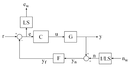 % Label the block I/Os Wn = 1/LS; Wn.u = 'nw'; Wn.y = 'n'; We = LS; We.u = 'e'; We.y = 'ew'; C0.u = 'e'; C0.y = 'u'; F0.u = 'yn'; F0.y = 'yf'; % Specify summing junctions Sum1 = sumblk('e = r - yf'); Sum2 = sumblk('yn = y + n'); % Connect the blocks together T0 = connect(G,Wn,We,C0,F0,Sum1,Sum2,{'r','nw'},{'y','ew'});