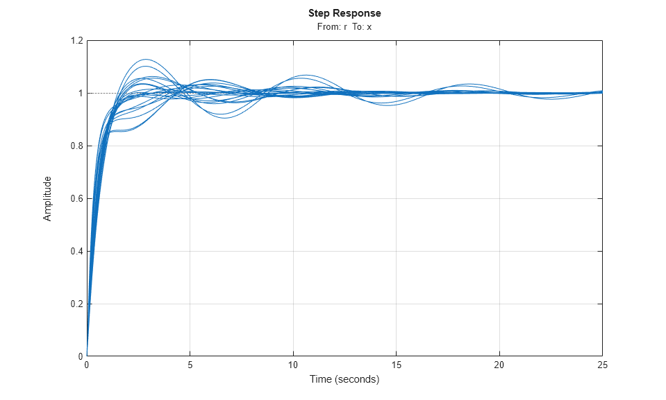 % Apply result of nominal tuning (ST) to uncertain closed-loop model UST0 setBlockValue(UST0,getBlockValue(ST)); Tnom = getIOTransfer(UST0,'r','x'); rng(0), step(Tnom,25), grid