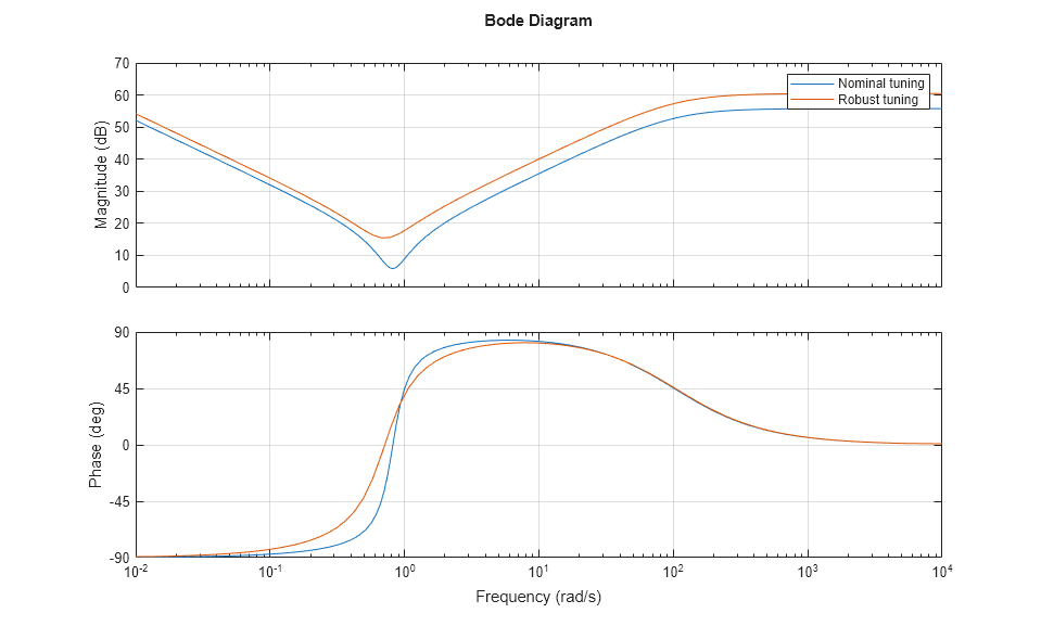 Cnom = getBlockValue(ST,'Controller'); Crob = getBlockValue(UST,'Controller'); clf, bode(Cnom,Crob), grid legend('Nominal tuning','Robust tuning')