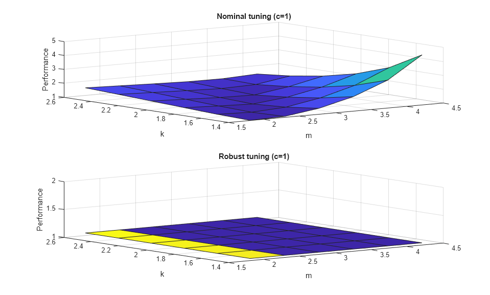 % Specify a 6-by-6 grid of (m,k) values for linearization ms = linspace(um.Range(1),um.Range(2),6); ks = linspace(uk.Range(1),uk.Range(2),6); [ms,ks] = ndgrid(ms,ks); params(1).Name = 'm'; params(1).Value = ms; params(2).Name = 'k'; params(2).Value = ks; STP = slTuner('rct_mass_spring_damper','Controller',params); % Evaluate performance index over (m,k) grid for nominally tuned PID setBlockValue(STP,'Controller',Cnom) [~,F1] = evalGoal(Req1,STP); [~,F2] = evalGoal(Req2,STP); Fnom = max(F1,F2); % Evaluate performance index over (m,k) grid for robust PID setBlockValue(STP,'Controller',Crob) [~,F1] = evalGoal(Req1,STP); [~,F2] = evalGoal(Req2,STP); Frob = max(F1,F2); % Compare the two performance surfaces clf subplot(211), surf(ms,ks,Fnom) xlabel('m'), ylabel('k'), zlabel('Performance'), title('Nominal tuning (c=1)') subplot(212), surf(ms,ks,Frob), set(gca,'ZLim',[1 2]) xlabel('m'), ylabel('k'), zlabel('Performance'), title('Robust tuning (c=1)')
