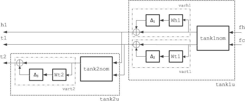 % Normalized error dynamics delta1 = ultidyn('delta1',[1 1]); delta2 = ultidyn('delta2',[1 1]); delta3 = ultidyn('delta3',[1 1]); % Frequency-dependent variability in h1, t1, t2 dynamics varh1 = 1+delta1*Wh1; vart1 = 1+delta2*Wt1; vart2 = 1+delta3*Wt2; % Add variability to nominal models tank1u = append(varh1,vart1)*tank1nom; tank2u = vart2*tank2nom; tank1and2u = [0 1; tank2u]*tank1u;
