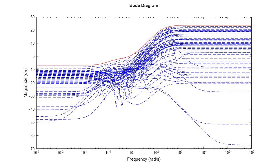 Verify that the filter magnitude (in red) "covers" the relative variations of the plant frequency response (in blue).