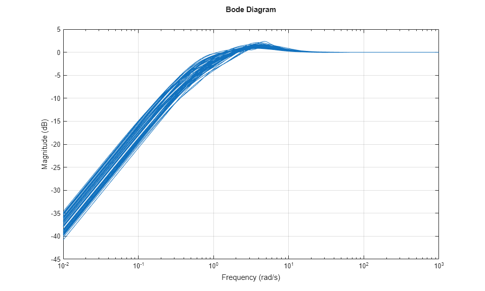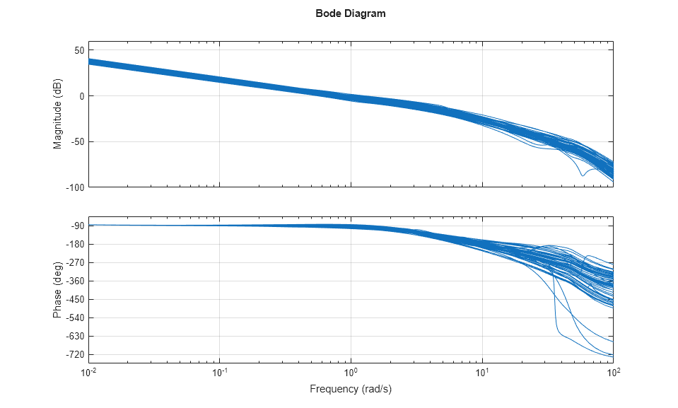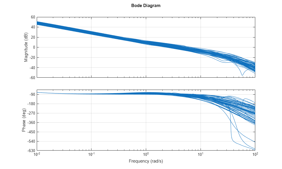 Since, here, muBound is approximately 0.9, the objectives are met, but could ultimately be improved upon. For validation purposes, create Bode plots of the open-loop response for different values of the uncertainty and note the typical zero-dB crossover frequency and phase margin: