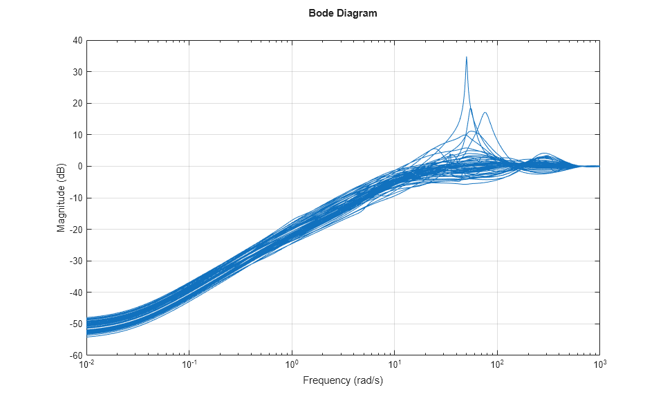 gamma = ureal('gamma',2,'Perc',30); % uncertain gain tau = ureal('tau',1,'Perc',30); % uncertain time-constant wn = 50; xi = 0.25; P = tf(gamma,[tau 1]) * tf(wn^2,[1 2*xi*wn wn^2]); % Add unmodeled dynamics delta = ultidyn('delta',[1 1],'SampleStateDim',5,'Bound',1); W = makeweight(0.1,20,10); P = P * (1+W*delta);