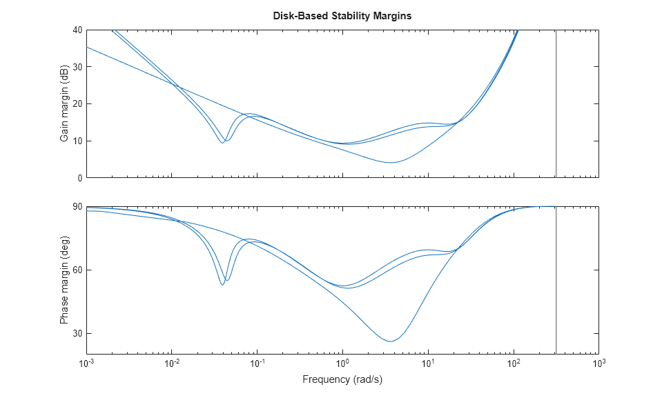Disk margins provide a stronger guarantee of stability than the classical gain and phase margins. Disk-based margin analysis models gain and phase variations as a complex uncertainty on the open-loop system response. The disk margin is the smallest such uncertainty that is compatible with closed-loop stability. (For general information about disk margins, see Stability Analysis Using Disk Margins.)