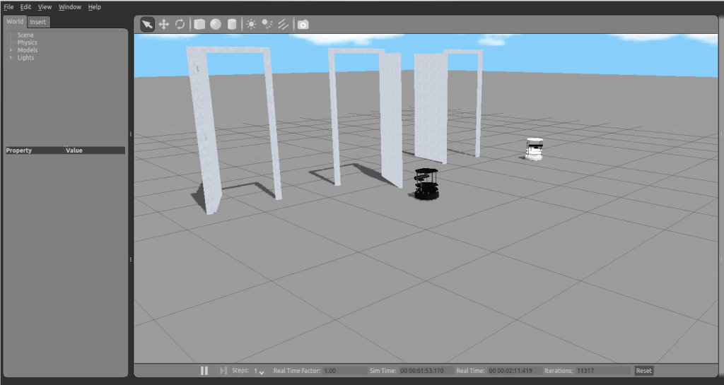 All units in Gazebo are specified using SI convention. With the doors added, the world looks like this image: