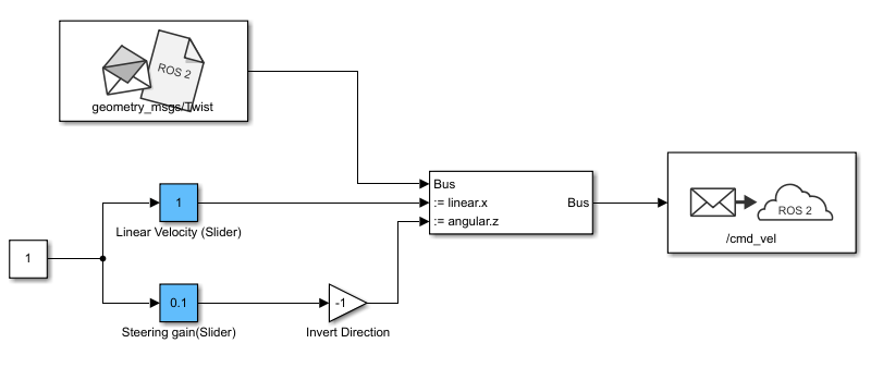 Specify your own. Enter/cmd_velin the Topic field. Click Select next to Message Type, selectgeometry_msgs/Twistfrom drop down list, and click OK.From the ROS Toolbox > ROS 2 tab in the Library Browser, drop a Blank Message block to the model. Double-click the block.