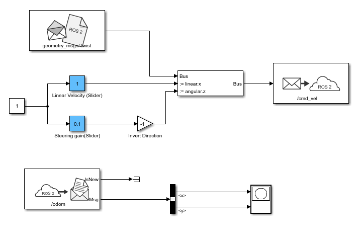 This example shows you how to configure a Simulink® model to send and receive information from a ROS-based simulator such as Gazebo® over a ROS 2 network.