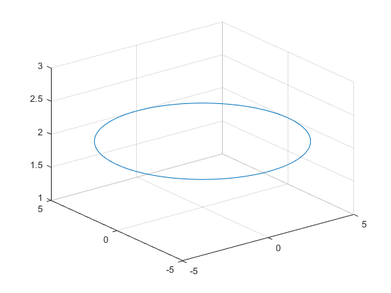 radius = 5.0; % radius in meters % Set the number of steps to divide the circular path numSteps = 100.0; numPoints = radius * numSteps; % Create [x,y] points along a circle with specified radius xpoints = radius * sin(linspace(-pi,pi,numPoints)); ypoints = radius * cos(linspace(-pi,pi,numPoints)); altitude = 2.0; % meters if isempty(coder.target) figure("Name","Circular trajectory"); plot3(xpoints,ypoints,altitude*ones(1,numPoints)); grid on; end