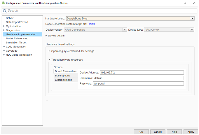 BeagleBone Blue.From the Groups list under Target Hardware Resources, select the Board Parameters option. The Device Address parameter displays the IP address of the most recently connected BeagleBone Blue hardware.