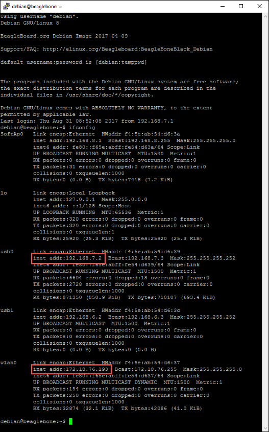 ifconfigcommand in the BeagleBone Blue command-line interface.usb0displays settings for the virtual network port on the USB port (defaultaddr:192.168.7.2).wlan0displays settings for the wireless connection.