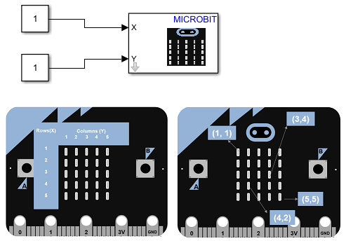 The LED matrix can be split into rows and columns. Any LED can be accessed by using its row number and column number. The LED/PlotXY block can light a single LED. For example, to light up the LED in the first row and first column, input 1 to the X port and 1 to the Y port.