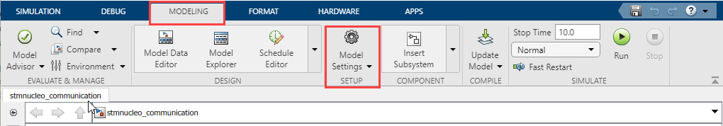 1. On the Simulink model toolbar, Open the Modeling tab and press CTRL+E to open Configuration Parameters dialog box.