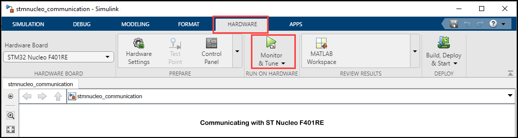 _ _ _ _ _ _ _ _ _ _ _ _ _ _ _ _ _ _ _ _ _ _ _ _ _ _ _ _7. On the Simulink model toolbar, click the Deploy To Hardware button. This action builds, downloads, and runs the model on the Nucleo board.