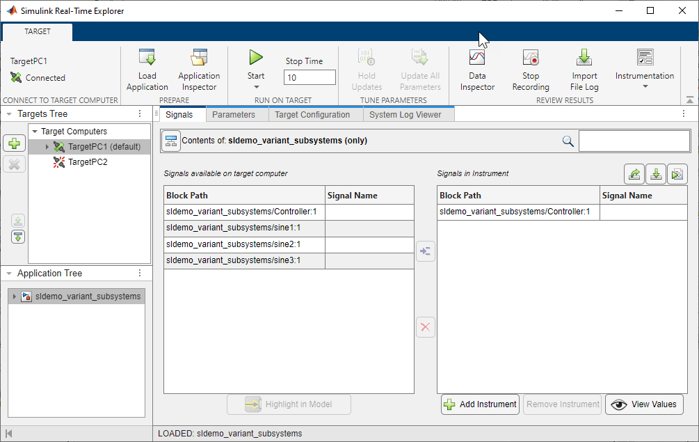 Load the real-time application slexVariantSubsystems.mldatx by clicking Load Application. In slrtExplorer, you can: