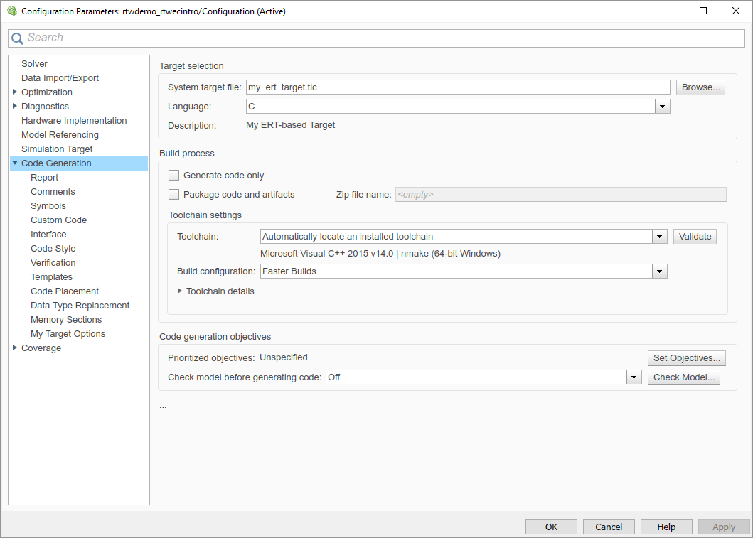 My ERT-based Targetand click OK.The Configuration Parameters dialog box now displays the Code Generation pane for