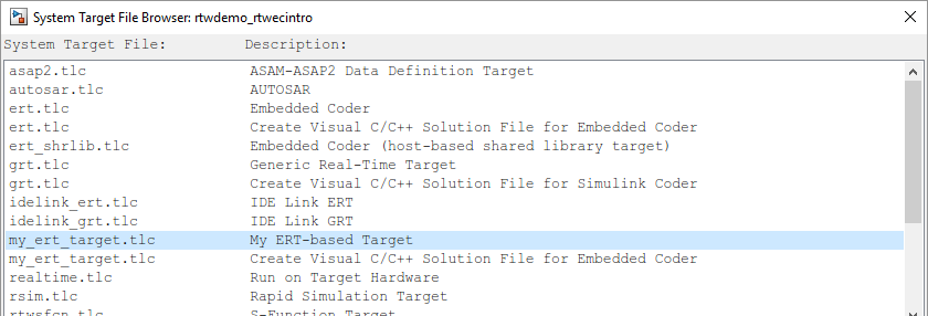 my_ert_target.tlcwith the following header comments.%% SYSTLC: My ERT-based Target TMF: my_ert_target_vcx64.tmf MAKE: make_rtw