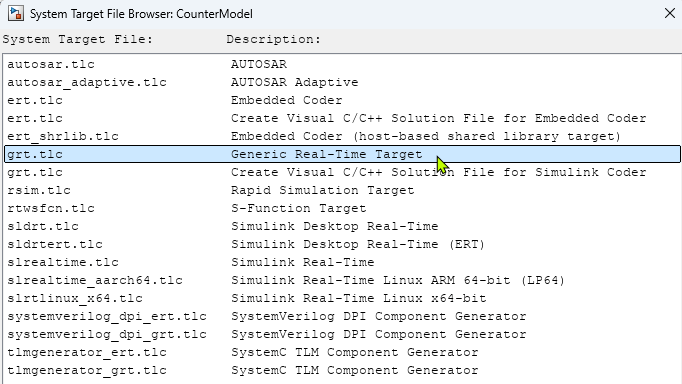 You can generate code for a specific target computer environment or purpose. Some options are provided by built-in system target files, which control the code generation process for a target computer environment.