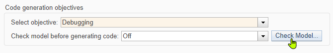 Optionally, in the Code generation objectives section, set parameter Select objective to Execution efficiency or Debugging. Then, to identify and systematically change parameters to meet your objectives, click Check model...