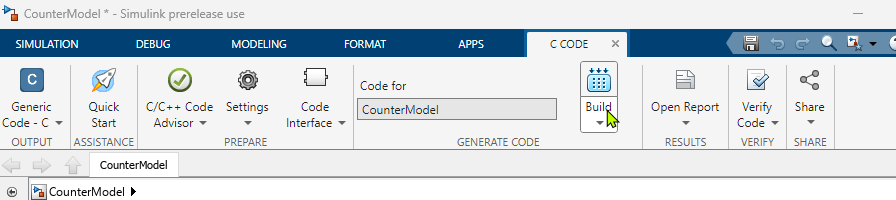 1. Open model CounterModel and configure the system target file to use grt.tlc.