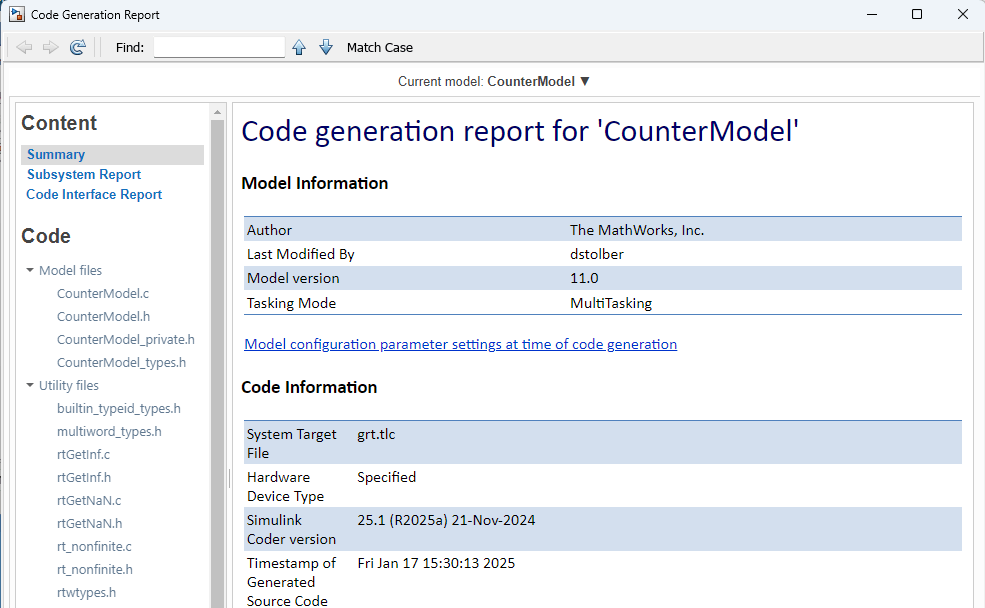 The report includes links to model files such as CounterModel.c and associated utility and header files.