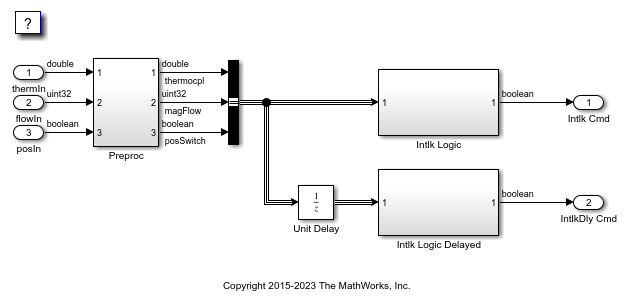 For the Unit Delay block, set Initial Value to a structure that specifies an initial condition for each of the three signal elements. To generate efficient code, match the data types of the structure fields with the data types of the corresponding signal elements. For example, set Initial Value to the expression struct('thermocpl',15.23,'magFlow',uint32(79),'posSwitch',false).