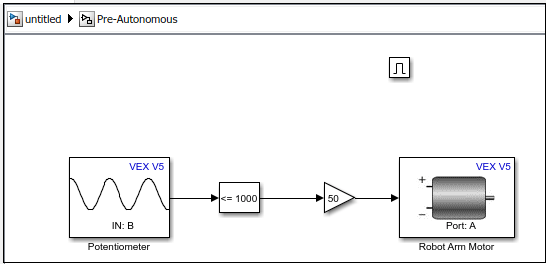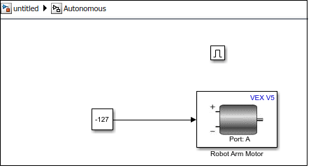 In this example, you will learn how to program Pre-Autonomous, Autonomous, and Driver Controlled modes in the same Simulink model that is deployed on V5 Robot Brain. You will create the control logic to perform these example actions: