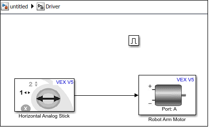 2. In the Simulink Library Browser, navigate to Simulink Coder Support Package for VEX EDR V5 Robot Brain > Actuators, and drag and drop the DC Motor block into the Driver subsystem. Rename the block to Robot Arm Motor.