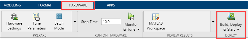 7. Open the Hardware tab and click Build, Deploy & Start. The model is deployed to the V5 Robot Brain.