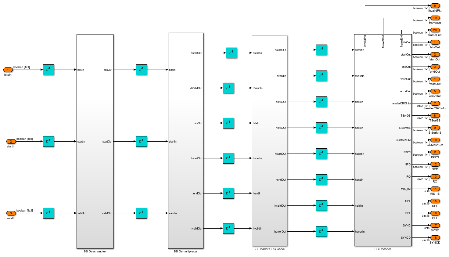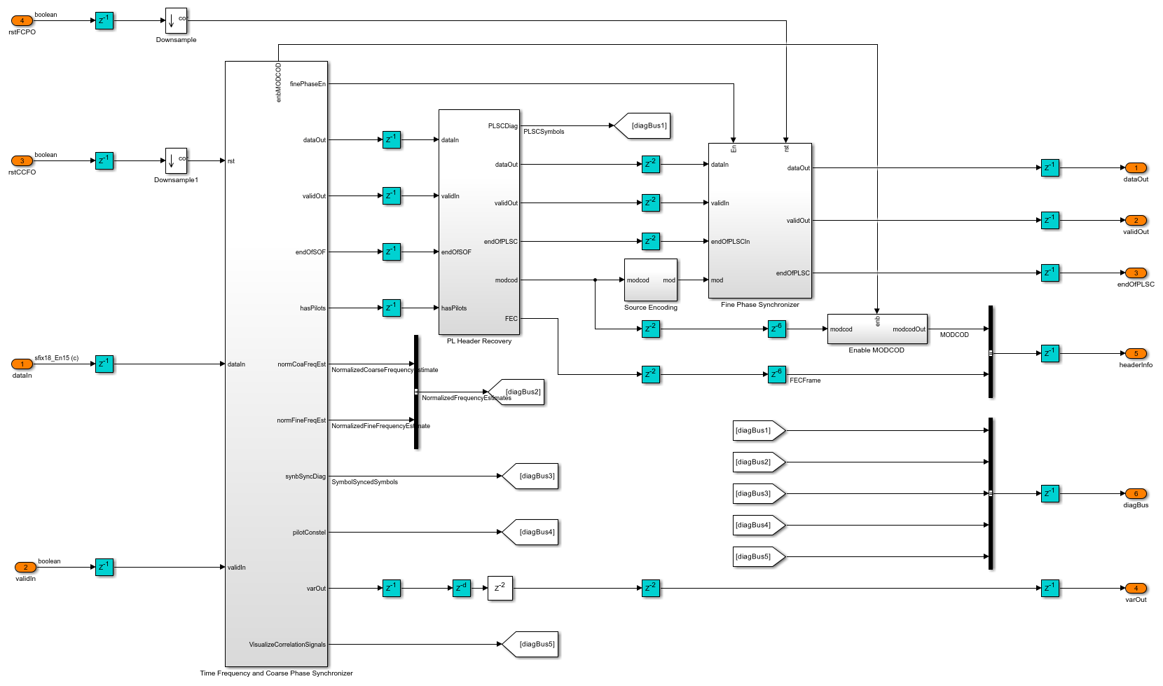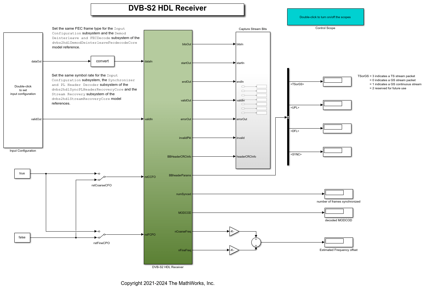 dvbs2hdlReceiver.slx— Top-level Simulink model.dvbs2hdlSyncPLHeaderRecoveryCore.slx— Model reference that synchronizes time, frequency, and phase, and decode PL header.dvbs2hdlBBFrameRecoveryCore.slx— Model reference that demodulates the symbols, deinterleaves the demodulated soft bits, and decodes the deinterleaved soft bits using forward error correction (FEC). It discards the frames that does not support the configuration according to [ 1 ].dvbs2hdlStreamRecoveryCore.slx— Model reference that recovers the stream of data bits.getdvbs2LDPCParityMatrices.m— Download the MAT file that stores LDPC parity check matrices that are used to generate the receiver input waveform.dvbs2hdlRxParameters.m— Generate parameters for thedvbs2hdlSyncPLHeaderRecoveryCore.slxmodel reference.dvbs2hdlPhaseNoise.m— Introduce phase noise to the input sequence.dvbs2hdlRxInit.m— Generate the transmitter waveform and initialize thedvbs2hdlSyncPLHeaderRecoveryCore.slxmodel reference.dvbs2hdlReceiverVerify.m— Gather PL header parameters and stream recovered bits.dvbs2hdlReceiverData.sldd— Simulink data dictionary to store bus signal configurations.