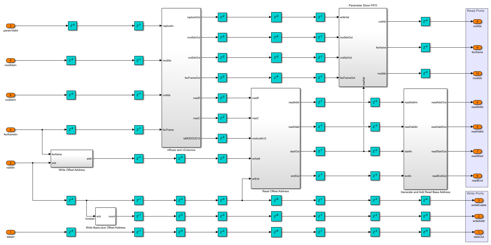 The DVB-S2 Deinterleaver subsystem in the dvbs2hdlBBFrameRecoveryCore model reference continuously stores the soft bits received from the DVB-S2 Symbol Demodulator (Wireless HDL Toolbox) inside the RAM subsystem. The RAM Address Generator subsystem generates the read and write logic to the RAM for deinterleaving.