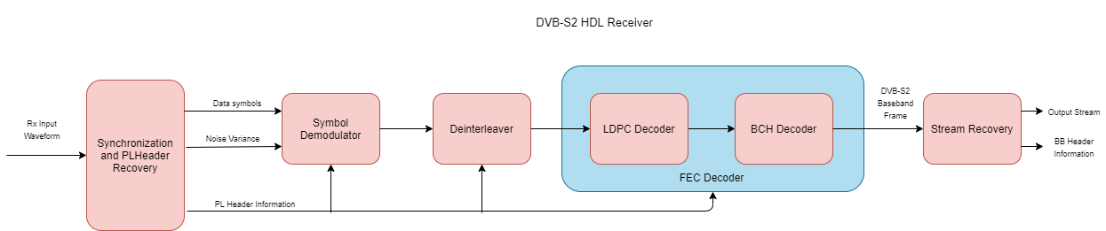 This section explains the high-level architecture of the DVB-S2 receiver model. The Synchronization and PLHeader Recovery block extracts the data symbols, estimates noise variance, and decodes physical layer (PL) header information from the Rx Input Waveform signal. The Symbol Demodulator block demodulates the data symbols and computes soft bits. The Deinterleaver block deinterleaves and FEC Decoder block decodes the soft bits to extract a DVB-S2 baseband frame signal. The Stream Recovery block extracts the BB header information and the output stream bits from the baseband frame.
