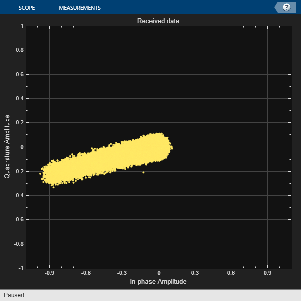 rxConst = comm.ConstellationDiagram(Title="Received data", ... AxesLimits=[-1 1], ... ShowReferenceConstellation=false, ... SamplesPerSymbol=rxParams.sps); rxConst(rxIn(1:100000))