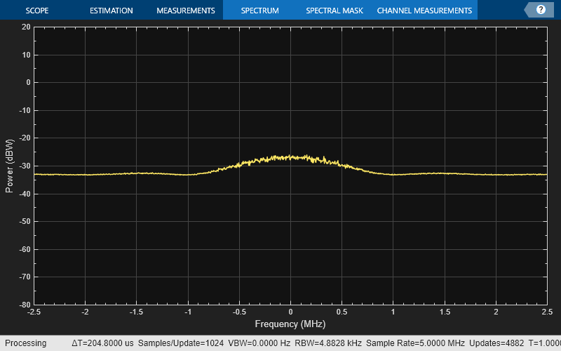 scope = spectrumAnalyzer(SampleRate=sampleRate,AveragingMethod="exponential",ForgettingFactor=1); scope.SpectrumUnits = "dBW"; % Plot only 1 sec of the waveform spectrum. wlen = sampleRate; % Number of samples corresponding to one second if length(gpswaveform) > wlen scope(gpswaveform(end-wlen+1:end)) else % If the length of the generated waveform is less than one second, % visualize the spectrum of the entire waveform scope(gpswaveform) end