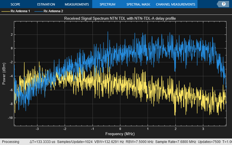 ntnTDLAnalyzer = spectrumAnalyzer(SampleRate = ntnTDLChan.SampleRate); ntnTDLAnalyzer.Title = "Received Signal Spectrum " ... + "NTN TDL with " + string(ntnTDLChan.DelayProfile) + " delay profile"; ntnTDLAnalyzer.ShowLegend = true; for nRx = 1:size(tdlOut,2) ntnTDLAnalyzer.ChannelNames{nRx} = "Rx Antenna " + nRx; end ntnTDLAnalyzer(tdlOut)