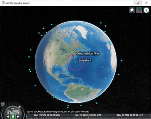Use satelliteScenarioViewer to launch a satellite scenario viewer and visualize the scenario. Hide the orbits and labels of satellites and ground stations by setting the ShowDetails name-value pair to false. Show labels for the geographical site and Satellite 4, and center the satellite in view.