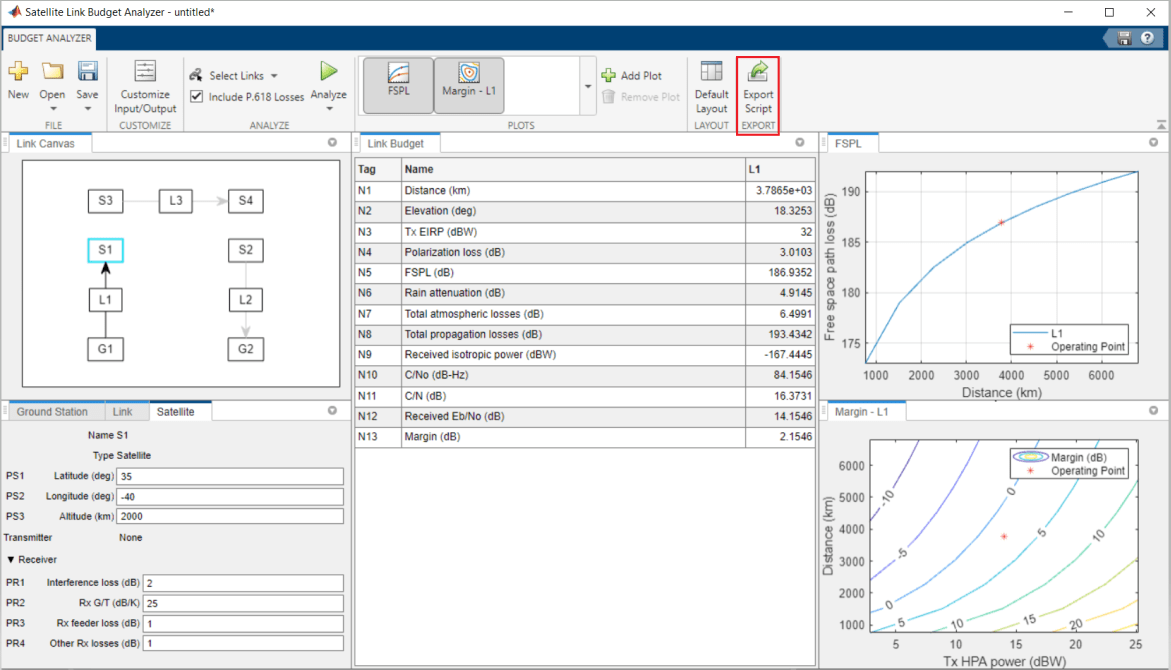Calculate and visualize the link budget results by using an exported MATLAB script.
