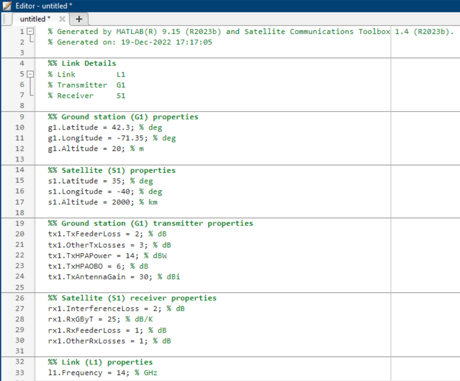 This figure shows a part of the generated script from the Satellite Link Budget Analyzer app.