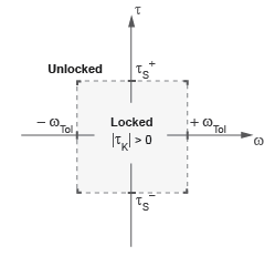 The schematic shows the conditions under which the clutch is locked and unlocked. The clutch is generally locked if the torque it transfers lies between its static friction torque limits and the magnitude of the slip velocity is smaller than its velocity tolerance. The clutch unlocked otherwise.
