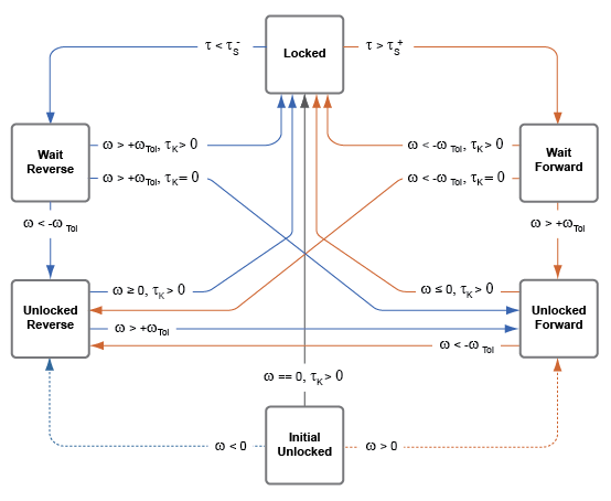 A clutch that starts simulation unlocked lacks a direction of motion. For this reason, after checking that the unlocked state is valid, the block automatically determines the appropriate direction of motion based on the driveline dynamics. Based on the direction of motion, the clutch then transitions to an unlocked-reverse or unlocked-forward state.