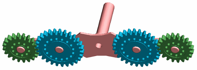 The Planet-Planet gear block represents a carrier and two inner-outer planet gear couples. Both planet gears are connected to and rotate with respect to the carrier. The planet gears corotate with a fixed gear ratio that you specify. For model details, see Equations.