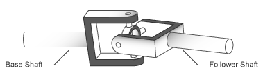 The two schematics in the figure illustrate the equation parameters. In each schematic, the left shaft represents the base shaft, while the right shaft represents the follower shaft. The right schematic shows the coupling seen in the left schematic after the shafts spin 90° about their length axes (dashed line segments).