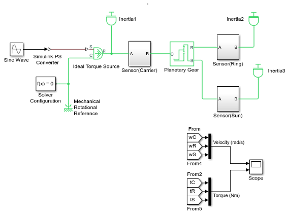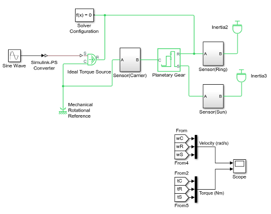 The carrier, connected to Mechanical Rotational Reference, does not move. The ring is driven with a sinusoidal torque, and the sun responds by spinning in the opposite direction (ring and sun gear wheels are external to one another) at twice the rate. The ring wheel has twice the radius (or twice the number of teeth) as the sun, so it spins half as fast.
