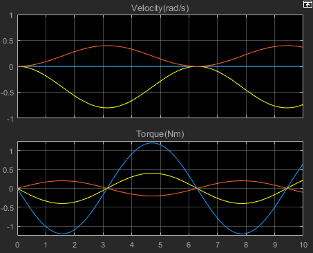 Open the Scope and start the simulation to observe the angular velocities of the ring, carrier, and sun, from largest to smallest. The ratio of the ring to sun gear velocities is always 2.
