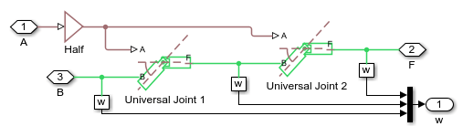 This example shows two methods to create a constant rotational velocity output using universal joints. In the first method, the angle of the universal joints is exactly opposite. The output shaft axis is parallel to the input shaft axis, but offset by some distance.