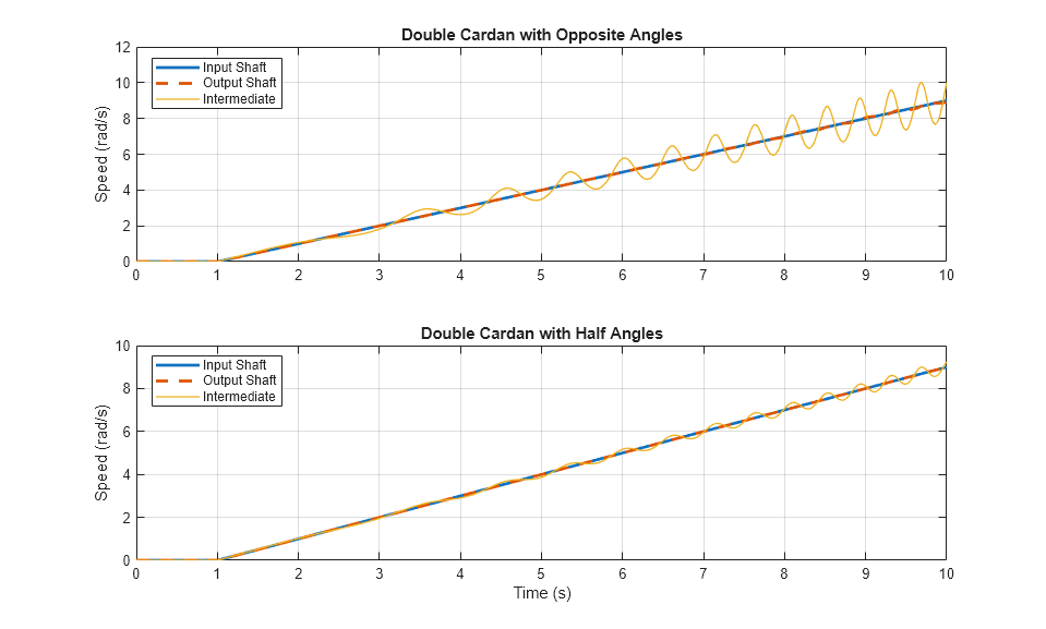 The plots below show the shaft speeds in double cardan joints. In each case, the output and input shaft speeds are identical. The intermediate shaft speed varies with the rotational angle of the shaft.