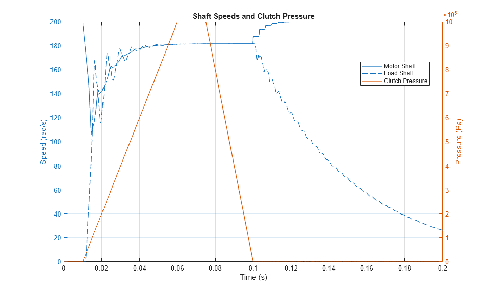 The plots below show the rotational speed of two flexible shafts as a clutch between them is locked and unlocked. The motor shaft is driven by a motor, and the load shaft is connected to a viscous damper. The oscillations triggered by the sudden engaging and disengaging of the clutch are due to the flexibility in the shafts.