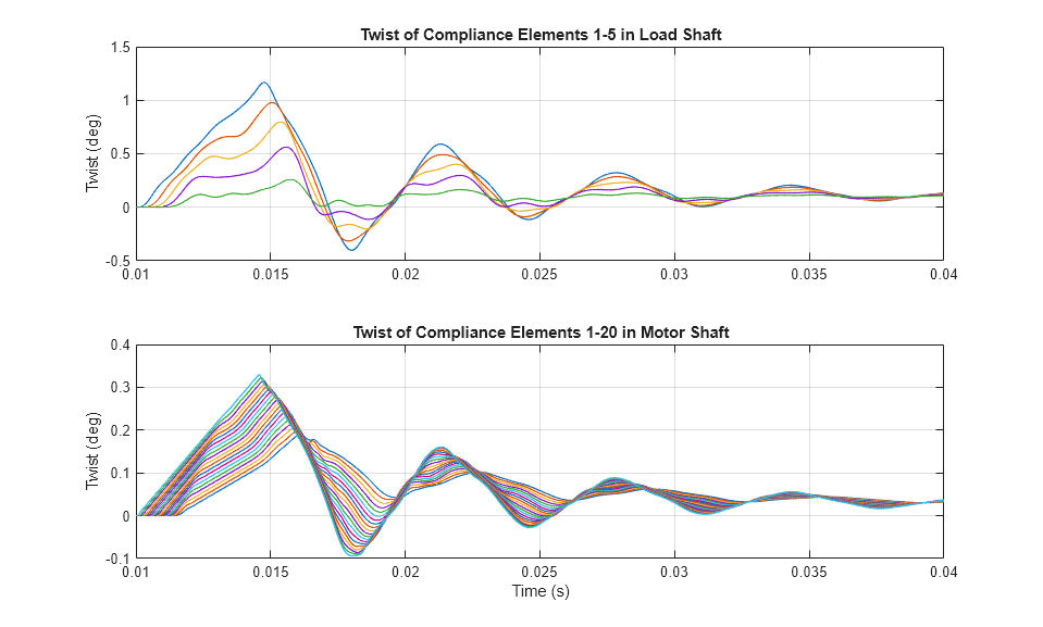 The plots below show the amount of twist in each compliance element of the flexible shafts as a clutch between them is locked and unlocked. Though the stiffness and dimensions are the same for each shaft, their behavior is slightly different because they are subjected to different loads. The motor shaft is driven by a motor, and the load shaft is connected to a viscous damper.
